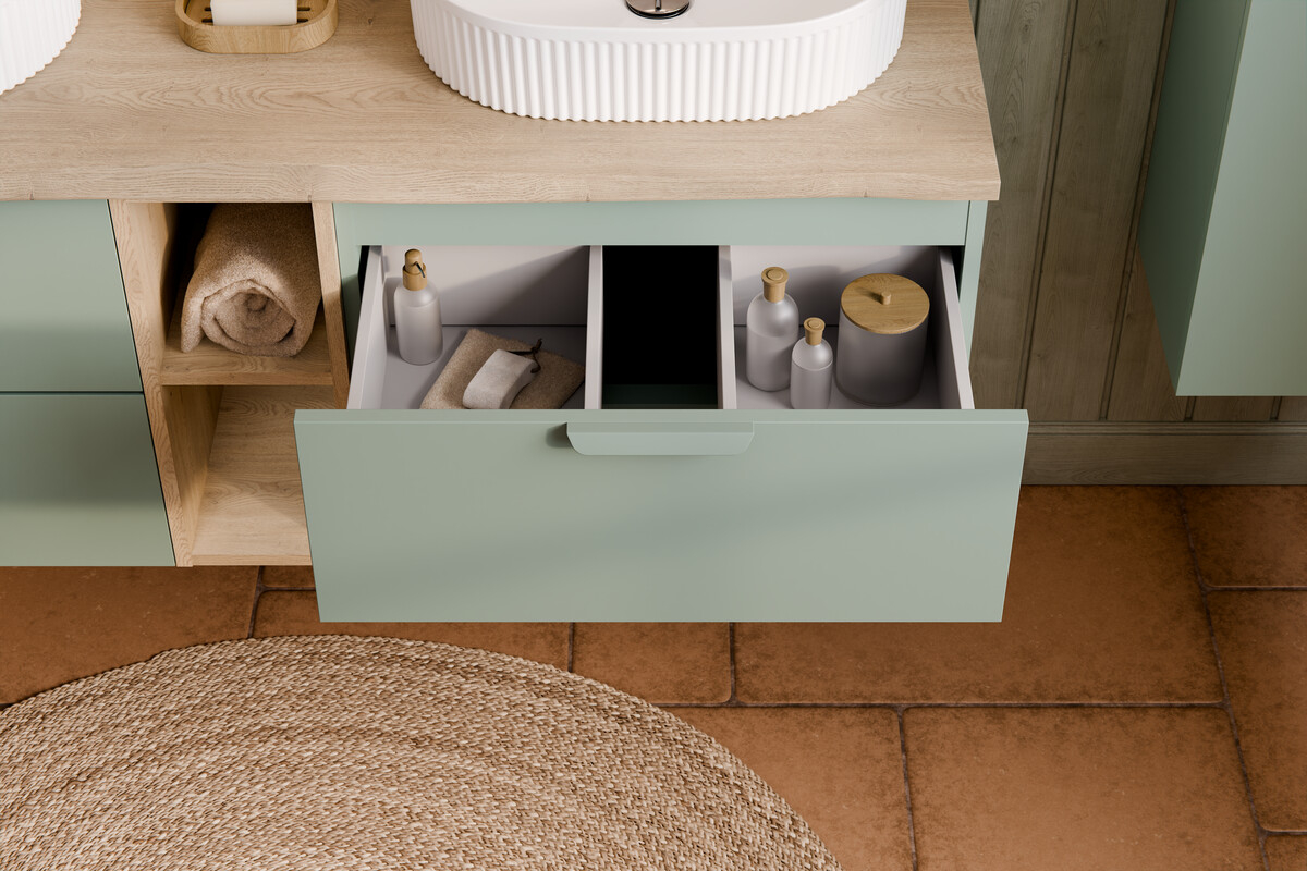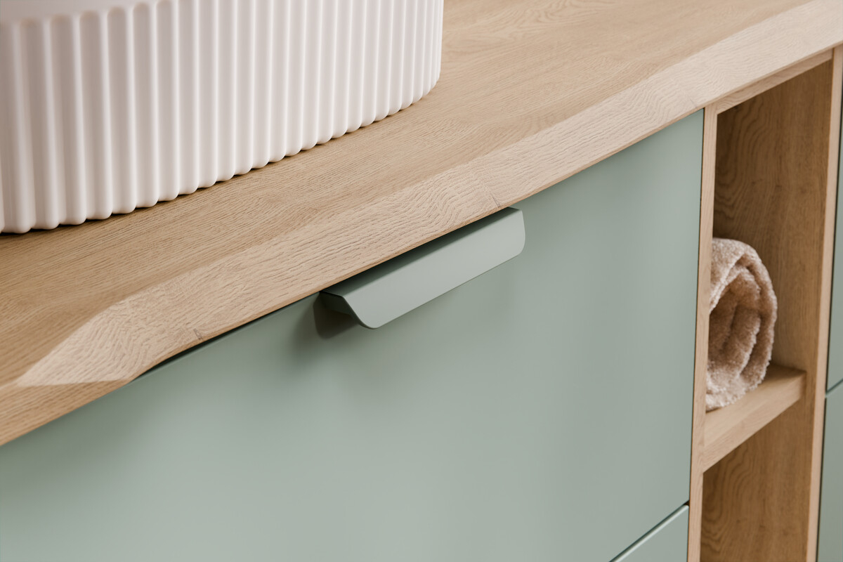 Mânerele lungi, integrate subtil în fațadă și perfect asortate cromatic, completează designul unitar al colecției.